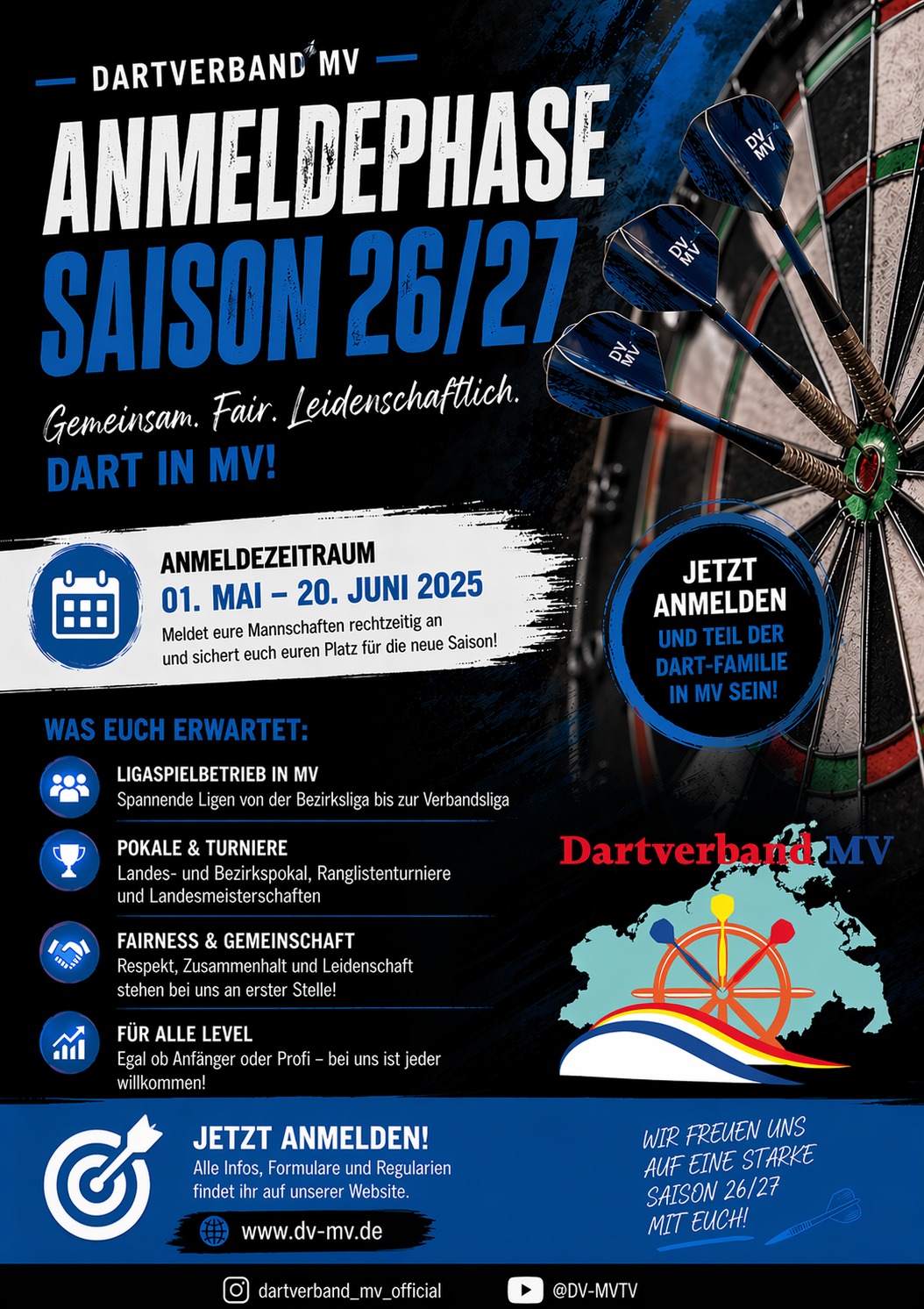 Seit September 2021 spielen wir unsere erste offizielle Saison des Dartverbandes MV. Damit hat die erste Saison überhaupt einer Steeldartliga in unserem Bundesland begonnen.